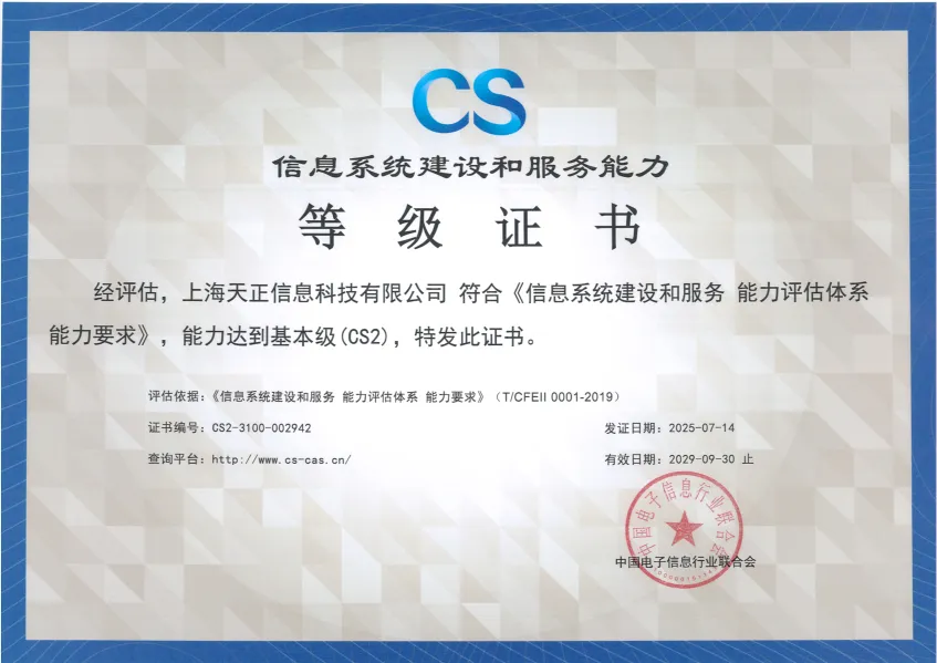 祝賀上海天正信息榮獲CS二級證書!
